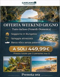 Offriamo bungalow confortevoli immersi nella natura, escursioni in barca tra grotte e calette nascoste, charter alle Isole Tremiti e itinerari esclusivi tra mare, foresta e borghi storici.